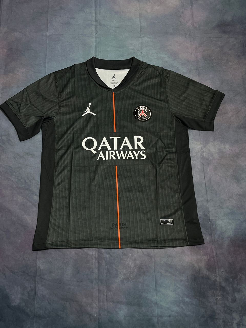 The Jordan PSG 25-26 fourth jersey features a distinctive dark, almost black base combined with silver and pink. The main color is a very dark gray with a slight brown/purple undertone (Off Noir). Officially, the...