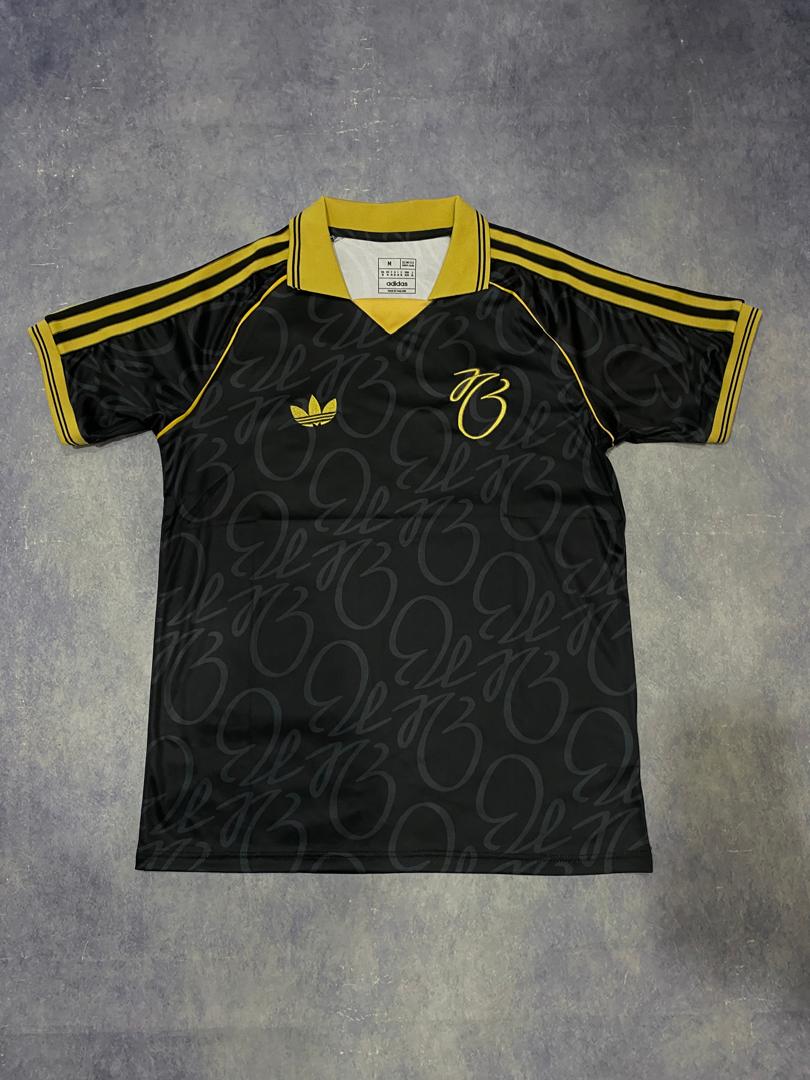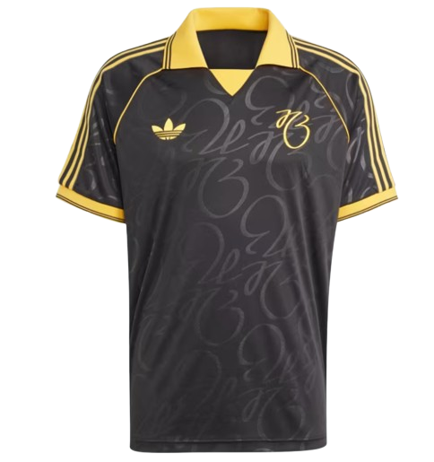 Adidas x Jude Bellingham Special Edition Jersey. It features a unique black and yellow color scheme, inspired by Bellingham's signature style. The jersey has a retro-inspired design with a bold all-over graphic and the iconic adidas Trefoil logo.