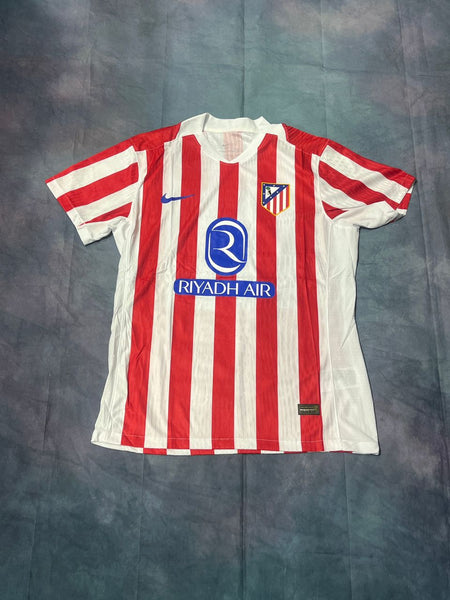 The Nike Atletico Madrid 2025-2026 home football shirt has the traditional white/red stripe design combined with blue for logos.
