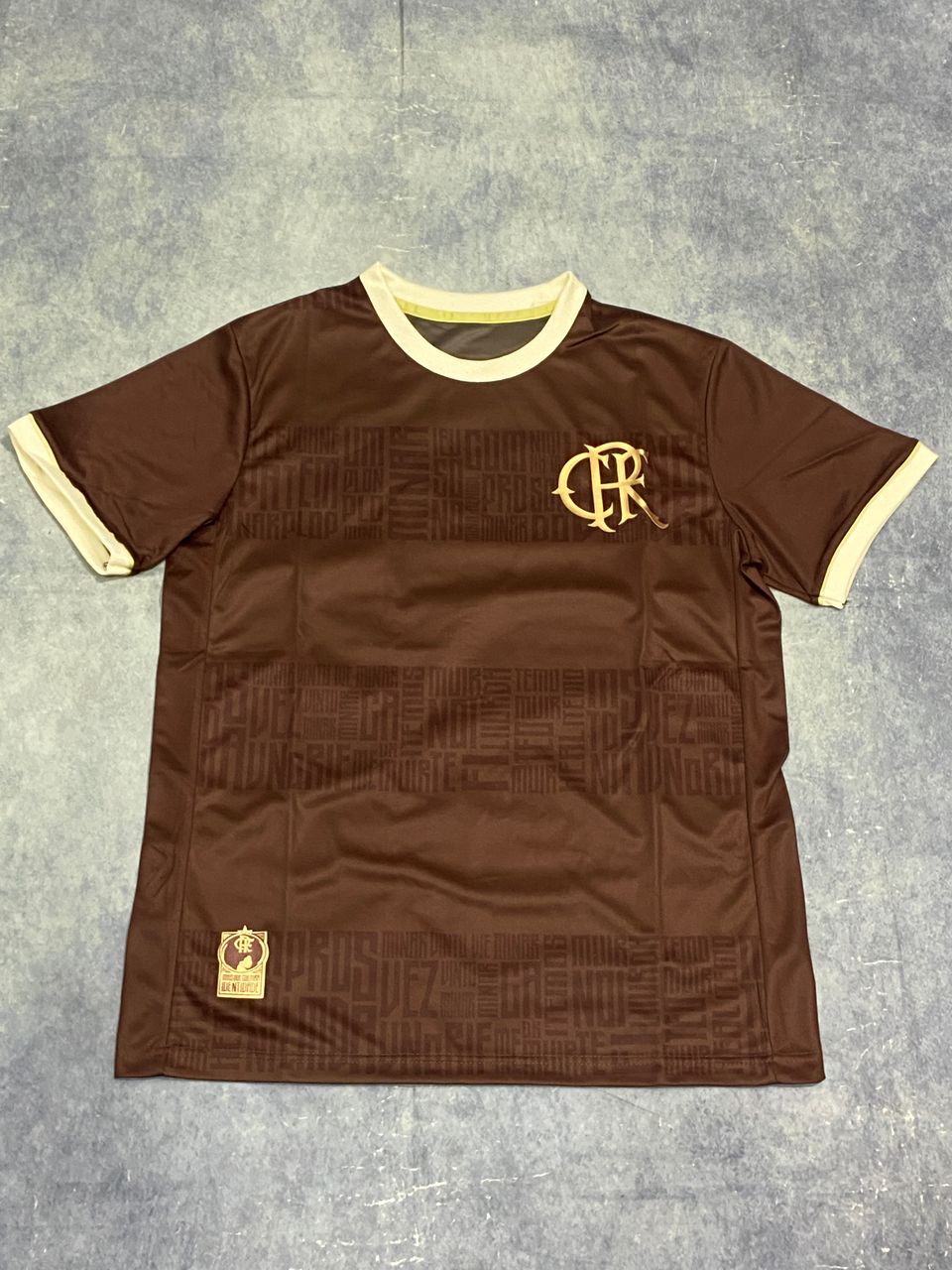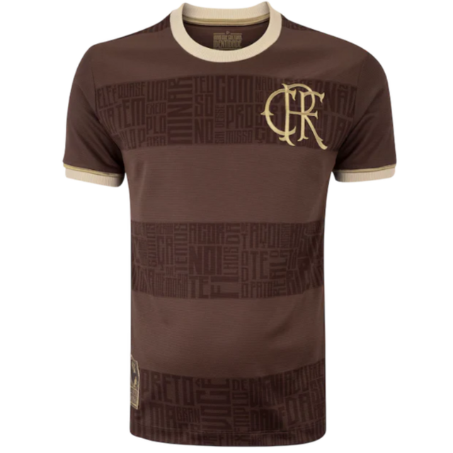 Flamengo’s Black November special edition jersey. It features a deep brown (almost black) colorway with subtle embossed typography across the fabric, likely referencing key club moments or phrases.