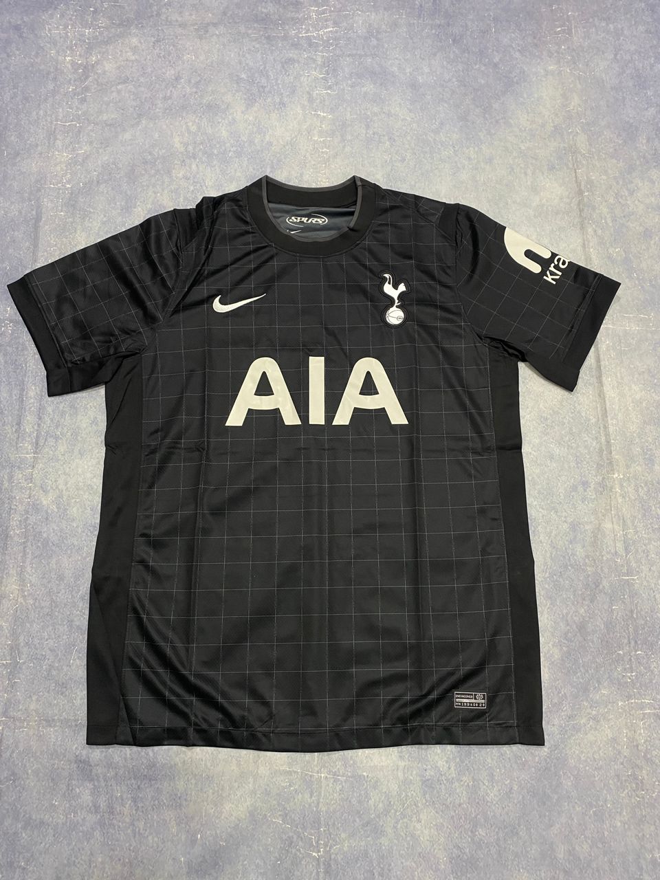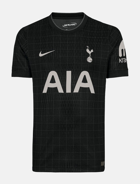 The Nike Tottenham 2025-26 away football shirt is predominantly black with grey accents (Lt Iron Ore) and white logos. This is the first time in over 10 years that Spurs' away shirt is black. The last time Tottenham's away shirt was black was in the 2014-15 season