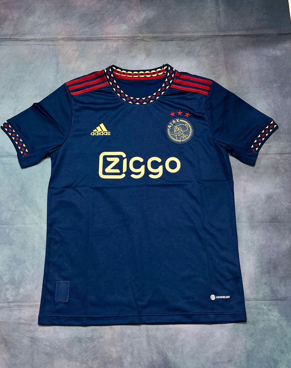 The Adidas Ajax 2022-23 away football shirt is navy with red / golden logos and 3 Stripes